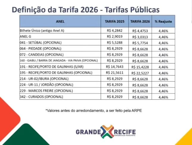 Com o aumento, a tarifa básica passou de R$ 4,27 para R$ 4,47, enquanto linhas de maior percurso, como Recife–Porto de Galinhas (opcional), subiram de R$ 21,60 para R$ 22,52. Os novos valores ainda dependem do arredondamento da Agência de Regulação de Pernambuco (Arpe), que deve homologá-los nos próximos dias.