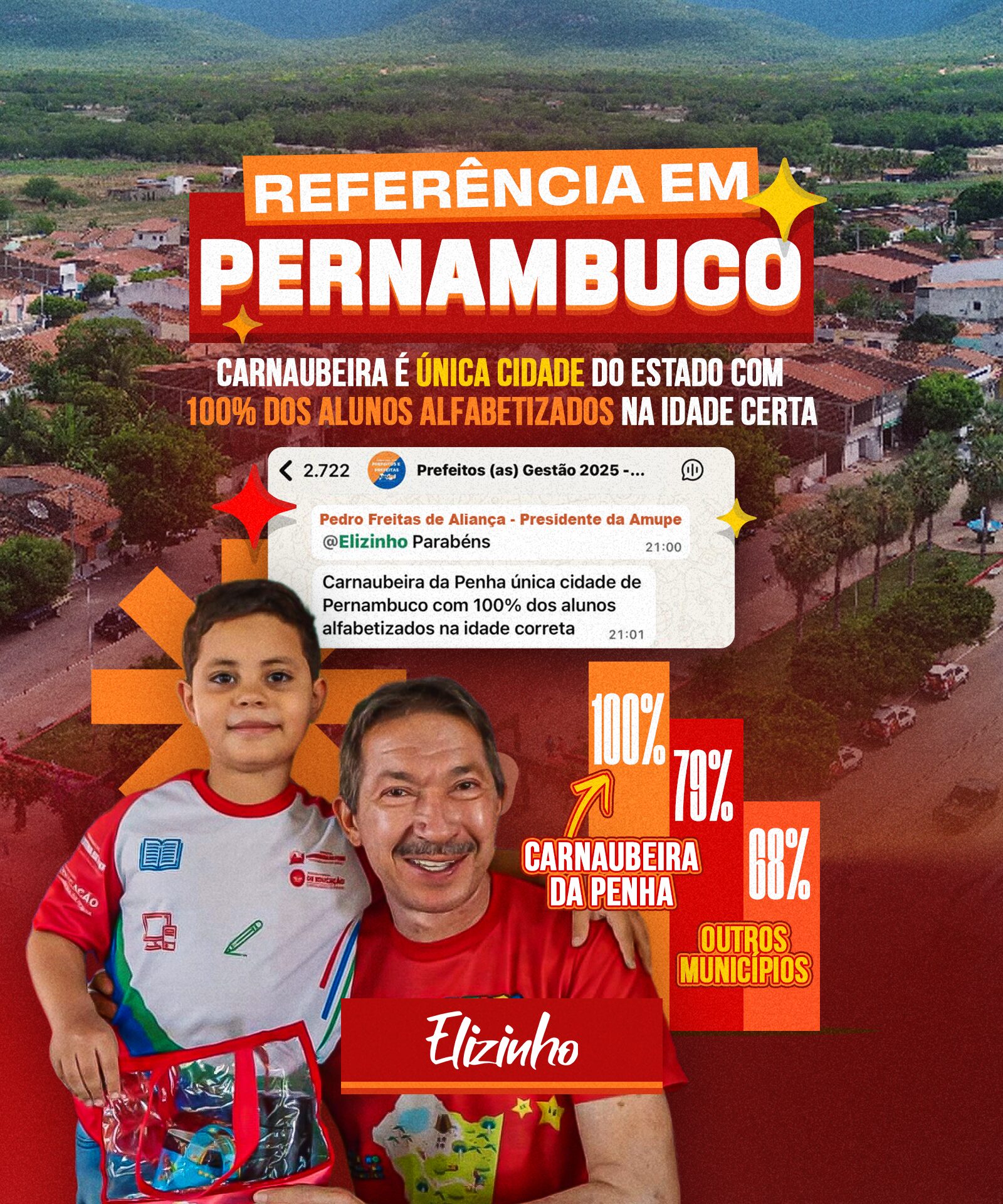 Carnaubeira alfabetiza 100% das crianças na idade certa – O município de Carnaubeira da Penha, no Sertão de Itaparica, alcançou recentemente a marca de 100% de crianças alfabetizadas na idade certa.