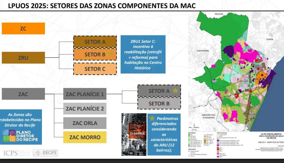 Os créditos, chamados de Potencial Construtivo Adicional (PCA), surgem em “áreas geradoras” — Boa Vista, Bairro do Recife e Santo Antônio/São José — e podem ser usados ou vendidos para projetos nas “áreas receptoras”, como Boa Viagem, Encruzilhada e parte da Zona de Reestruturação Urbana 1.