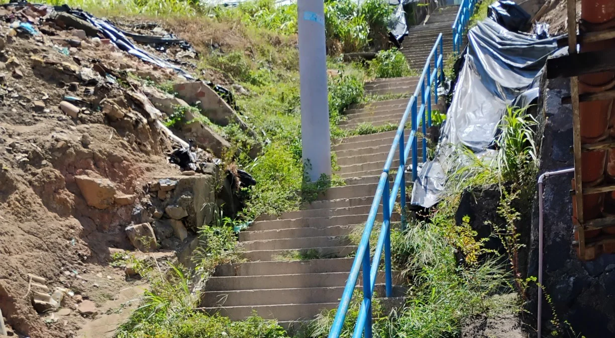 Matagal em escadaria de Nova Descoberta – Moradores da Rua Ourânia, na Zona Norte do Recife, denunciam o avanço da vegetação que tomou conta dos degraus e do entorno da via, dificultando a passagem de pedestres e aumentando o risco de acidentes.