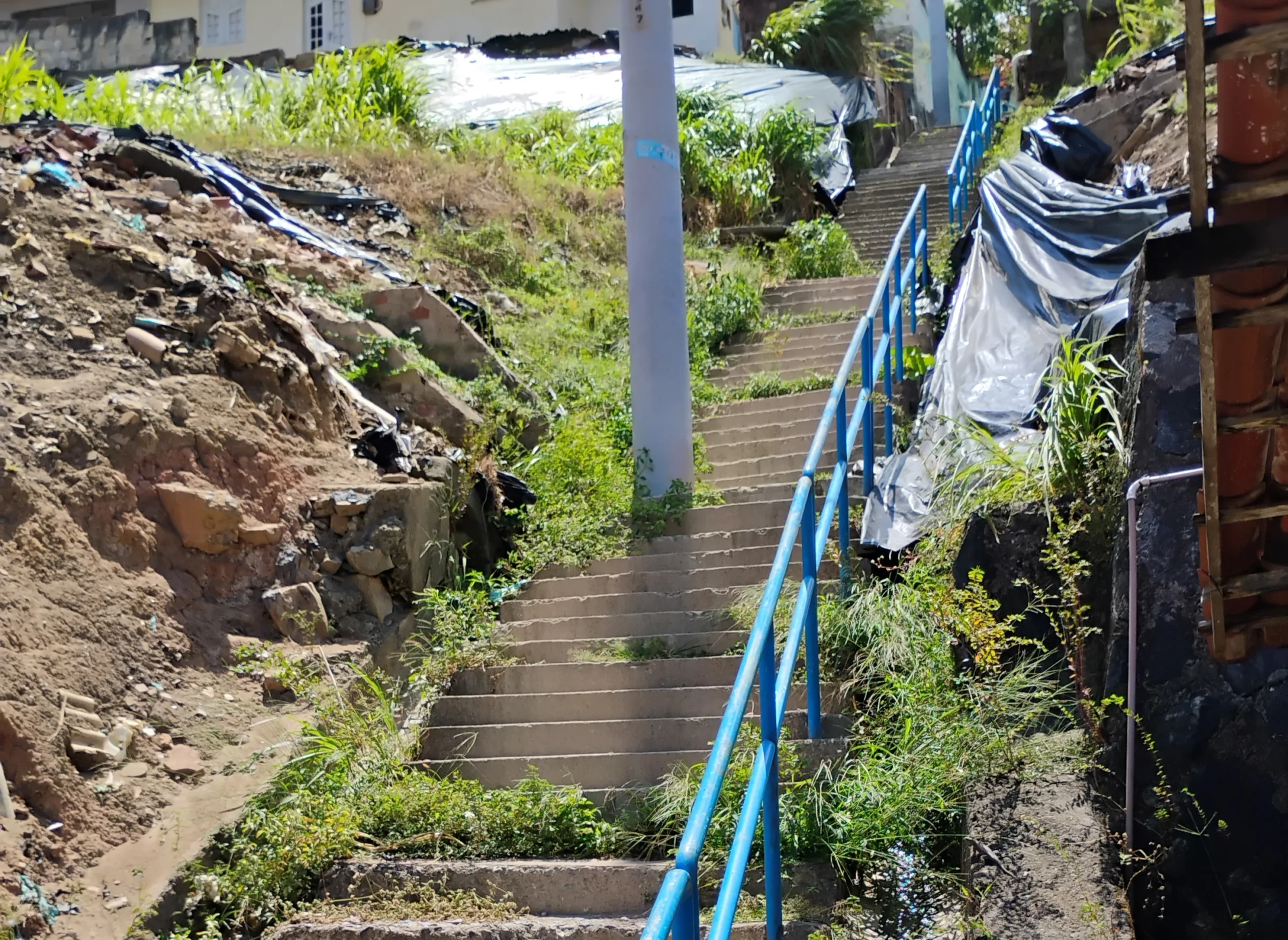 Segundo relatos enviados ao Pernambuco Conectado, a falta de capinação transformou a escadaria em um corredor estreito, forçando transeuntes a disputar espaço com o mato alto.