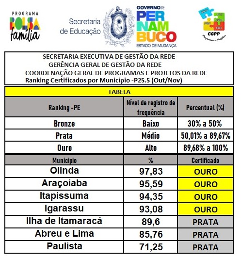 Olinda conquista Selo Ouro em frequência escolar – No bimestre de outubro e novembro de 2025, o município registrou 97,83% de frequência entre estudantes beneficiários do Bolsa Família. O índice é o maior já aferido pela Prefeitura de Olinda.