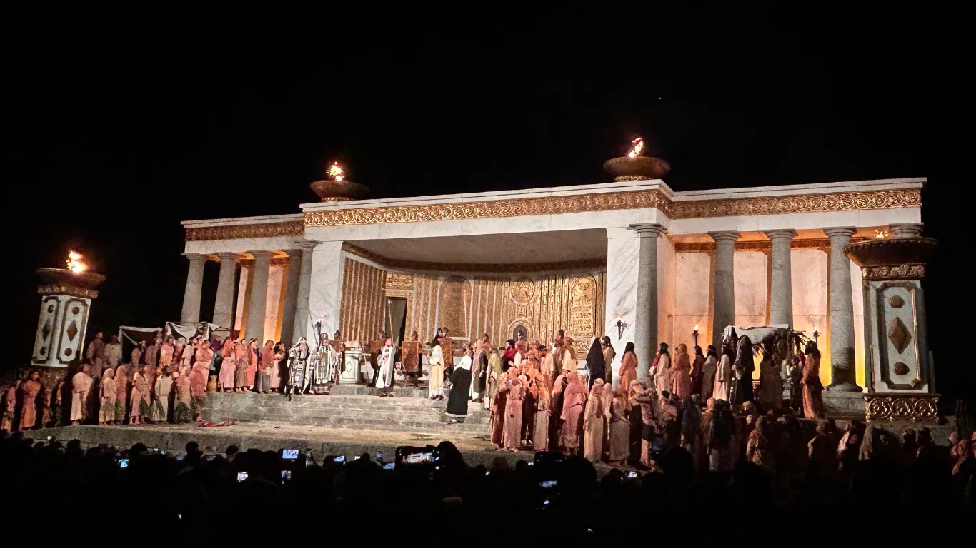 O percurso dentro da cidade-teatro é contínuo e leva os espectadores por locais que recriam o Templo de Jerusalém, o Fórum Romano, o Monte das Oliveiras e o Calvário.