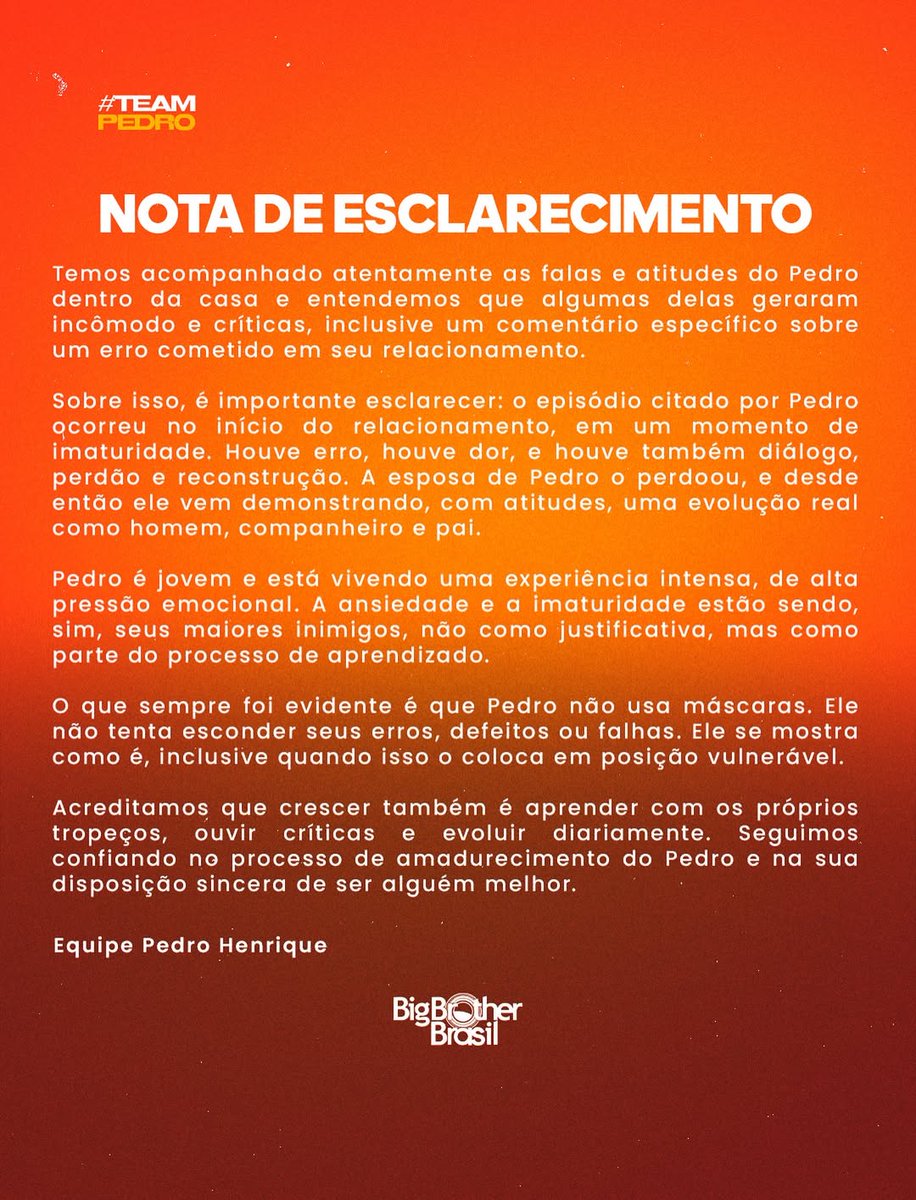 No meio da tarde, a assessoria do brother publicou nota explicando “erro, dor, diálogo e reconstrução”. O texto destaca que o casal superou o episódio e que Pedro, agora pai, demonstra “evolução real como homem, companheiro e pai”.