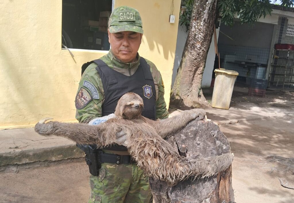 Moradores acionaram o telefone 153 ao perceberem a presença da preguiça no quintal. Minutos depois, a guarnição ambiental chegou ao local com luvas de proteção e caixa de transporte adequada.