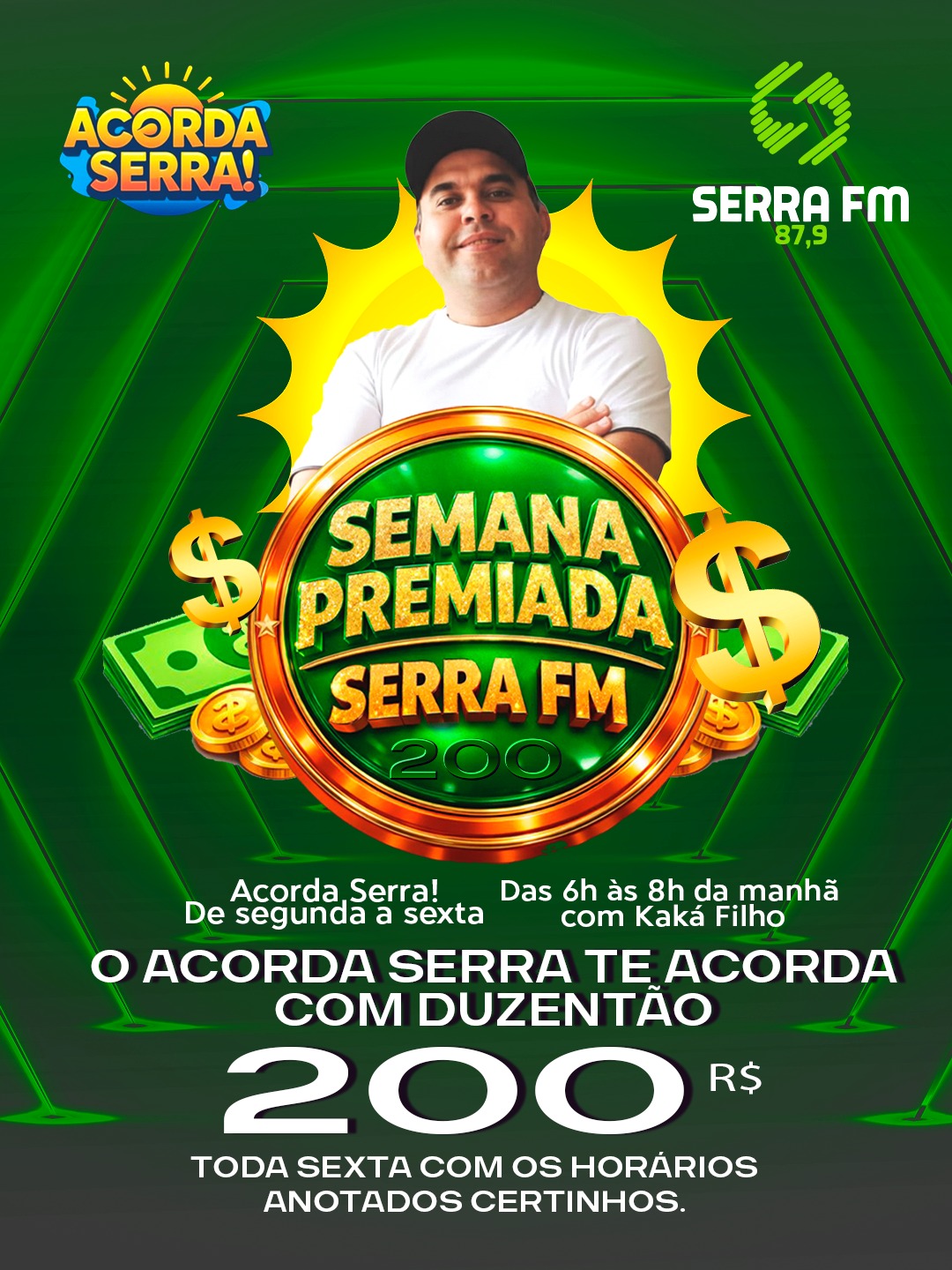 Semana Premiada da Serra FM sorteia R$200 toda semana – O programa Acorda Serra, comandado por Kaká Filho na rádio comunitária Serra FM (87,9 MHz), anunciou recentemente a promoção “Semana Premiada”, que dará R$ 200 em dinheiro a um ouvinte cadastrado toda sexta-feira.