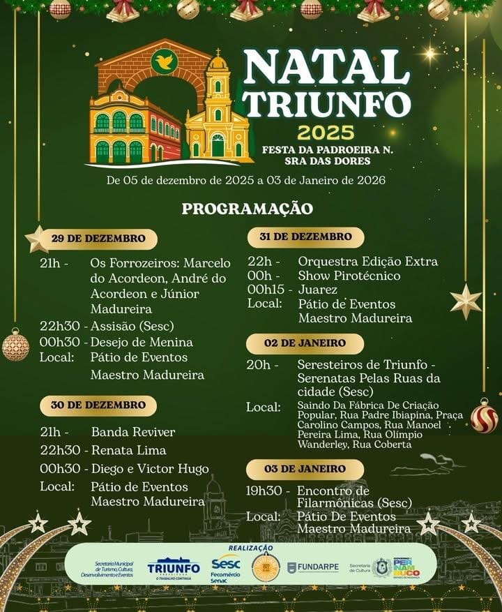 Serenata em Triunfo e encontro de filarmônicas – A charmosa cidade serrana do Sertão do Pajeú fecha a programação natalina e as homenagens à padroeira Nossa Senhora das Dores com dois dias de música ao ar livre.