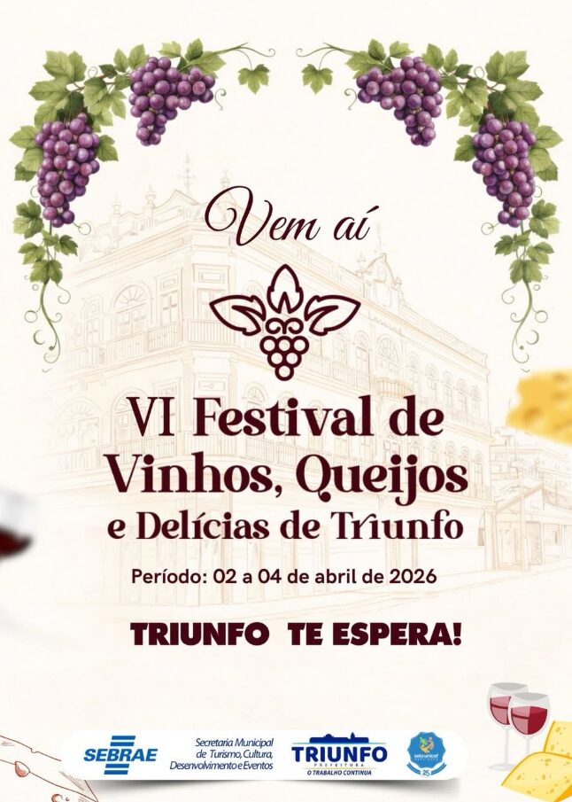 Triunfo: VI Festival de Vinhos, Queijos e Delícias – A Prefeitura de Triunfo, por meio da Secretaria Municipal de Turismo, Cultura, Desenvolvimento e Eventos, confirmou a realização do VI Festival de Vinhos, Queijos e Delícias entre os dias 2 e 4 de abril de 2026 no município.