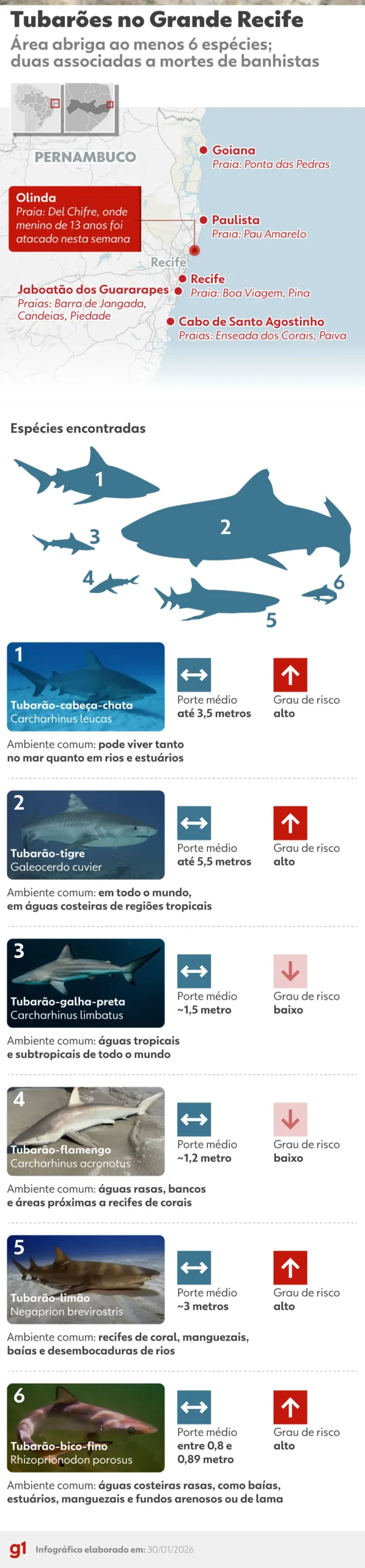 Tubarões no Grande Recife: seis espécies e apenas duas fatais – Levantamento do Comitê Estadual de Monitoramento de Incidentes com Tubarões (Cemit) indica 82 ataques na costa pernambucana desde 1992, mas só o tubarão-cabeça-chata e o tubarão-tigre foram associados a mortes na região.