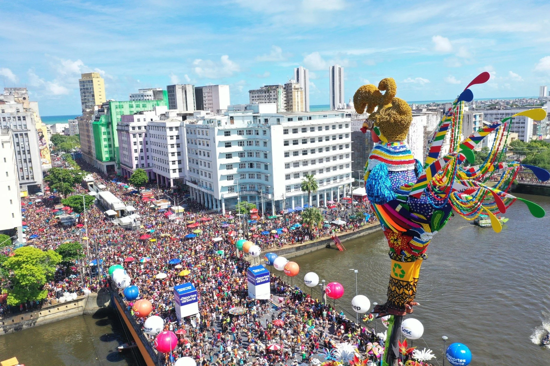 Uma supercâmera instalada no Edifício Leão garantirá imagens panorâmicas, enquanto outra lente no Hotel Plaza mostrará a frente e a retaguarda da escultura gigante, detalhando a chegada dos foliões, segundo a Prefeitura do Recife.