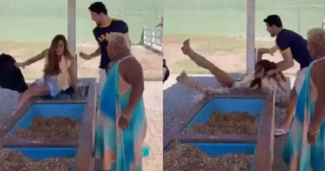 Vaca derruba Nicole Bahls e ela cai em bebedouro