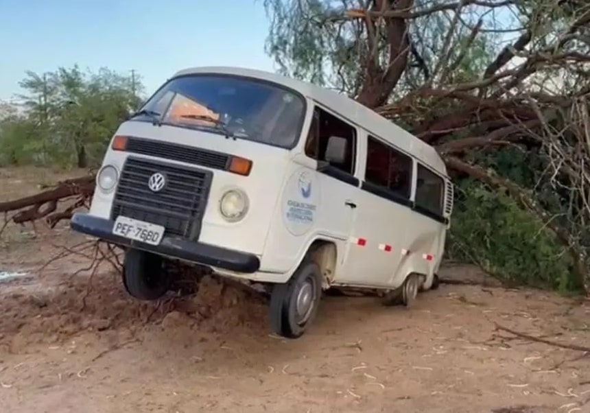 Em outra ocorrência, uma árvore caiu sobre uma Kombi estacionada, levantando a dianteira do veículo. Residências também foram afetadas: o portão de uma casa foi lançado a metros de distância, evidenciando a força do fenômeno, segundo relatos locais e o boletim da Apac.